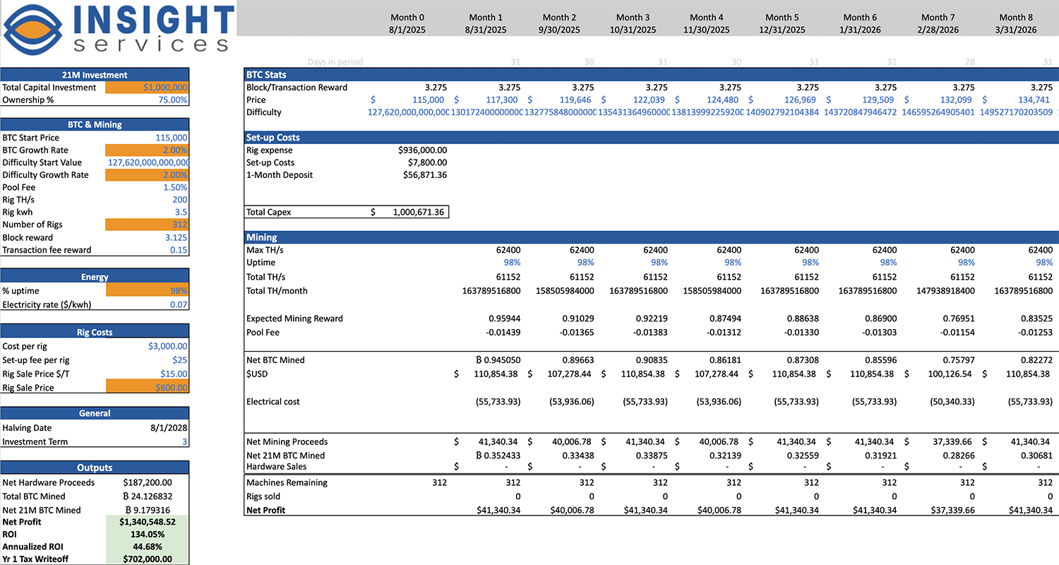 21M by Insight Services offers accredited investors a clear and direct opportunity to participate in Bitcoin mining. Forget about short-term market speculation. This is about engaging with the very foundation of Bitcoin, the infrastructure where new Bitcoin is created and the network is secured.